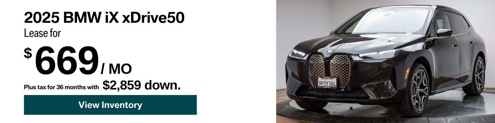 Lease this 2025 BMW IX XDR50 (Stock #: B62060SL VIN: WB523CF05SCT31212), with $2859.5 down at $669 for 36 months, on approved credit. No security deposit required. $4453.5 due at signing - includes 1st mo. payment of $669, customer down payment of $2859.5 and $925 acquisition fee. Must finance through BMWFS. Selling price based on MSRP $100575 minus $15476.07 dealer contribution and Lease Credit of $10000. Tax, title, license, and $85 dealer doc fee are extra. Offer assumes these paid at time of sale. Lessee responsible for maintenance, repairs, excessive wear and tear, and $0.3/mile over 10,000 miles/year. Early lease termination fee may apply. Option to purchase vehicle at lease end is $52299. Offer cannot be combined with any other offers. Residential restrictions may apply. Available on in-stock units only. See dealer for complete details. Offer Expires: 8/30/25.