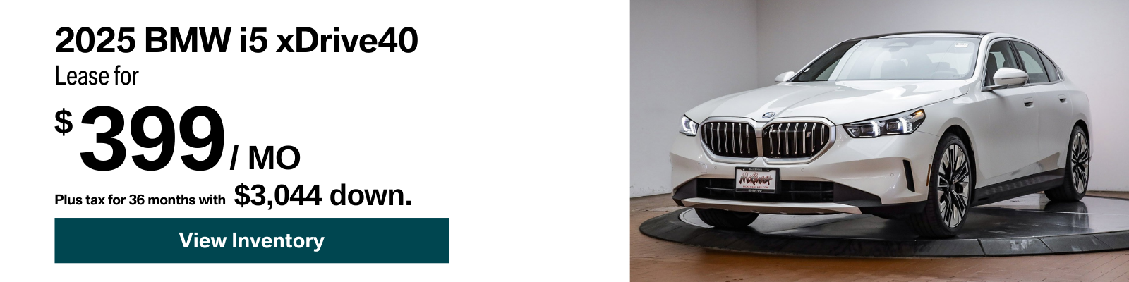 Lease this 2025 BMW I5 XDR40 (Stock #: B61356SL VIN: WBY13HG09SCS56718), with $3,043.98 down at $399 for 36 months, on approved credit. No security deposit required. $4,367.98 due at signing - includes 1st mo. payment of $399, customer down payment of $3,043.98 and $925 acquisition fee. Must finance through BMWFS. Selling price based on MSRP $75,495 minus $10,840.02 dealer contribution and Lease Credit of $10,900. Tax, title, license, and $85 dealer doc fee are extra. Offer assumes these paid at time of sale. Lessee responsible for maintenance, repairs, excessive wear and tear, and $0.25/mile over 10,000 miles/year. Early lease termination fee may apply. Option to purchase vehicle at lease end is $37,747.5. Offer cannot be combined with any other offers. Residential restrictions may apply. Available on in-stock units only. See dealer for complete details. Offer Expires: 8/30/25.