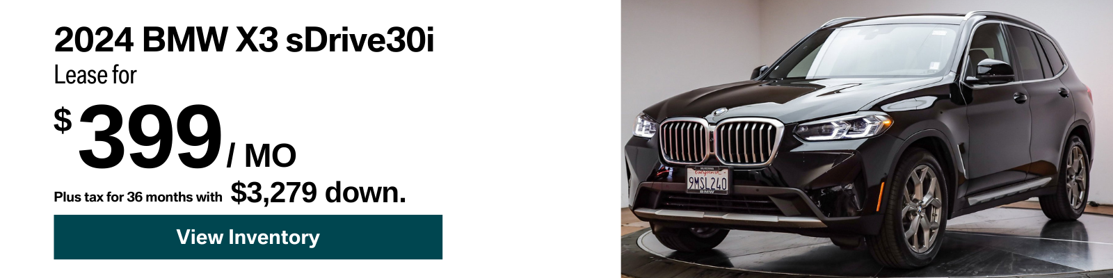 Lease this 2024 BMW X3 (Stock #: B61191SL VIN: WBX47DP03RN279361), with $3279.28 down at $399 for 36 months, on approved credit. No security deposit required. $4603.28 due at signing - includes 1st mo. payment of $399, customer down payment of $3279.28 and $925 acquisition fee. Must finance through BMWFS. Selling price based on MSRP $52645 minus $9223.24 dealer contribution and Lease Credit of $2500. Tax, title, license, and $85 dealer doc fee are extra. Offer assumes these paid at time of sale. Lessee responsible for maintenance, repairs, excessive wear and tear, and $0.25/mile over 7500 miles/year. Early lease termination fee may apply. Option to purchase vehicle at lease end is $30007.65. Offer cannot be combined with any other offers. Residential restrictions may apply. Available on in-stock units only. See dealer for complete details. Offer Expires: 8/30/25.